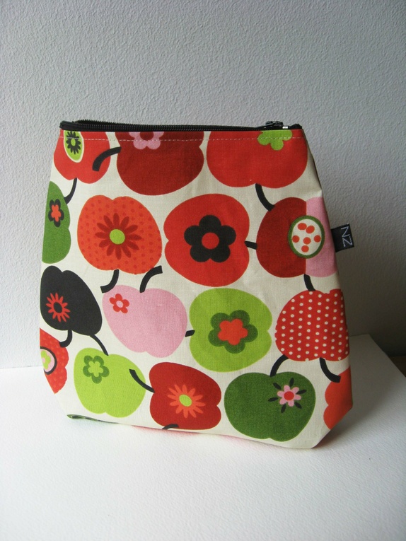 Mellomstor pung med 15 cm glidelåsåpning. Pungen er sydd i et beige plastbelagt bomullsmateriale med epler og blomster i høstfarger. Her og der et lite innslag av både rosa og grønt og en sort glidelås.