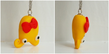 Monstersmykke med et gult monster som har pynta seg med en stor rød sløyfe. Selvlysende øyne.