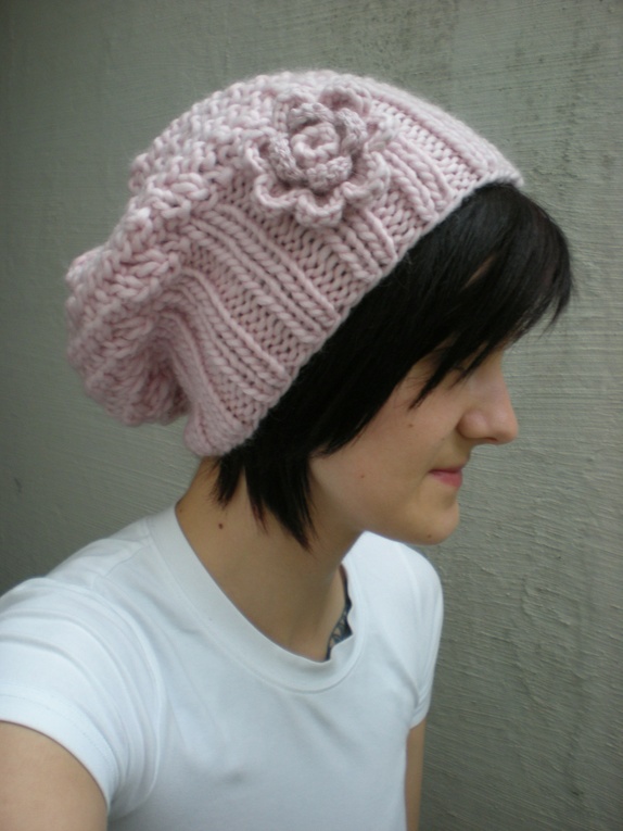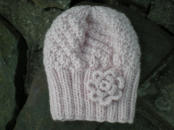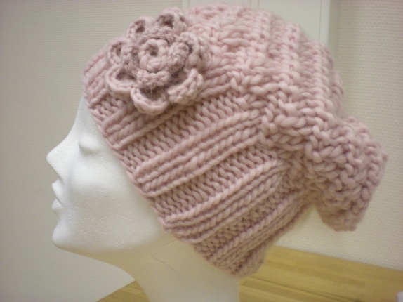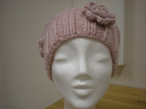 Strikket i Eskimo Garn fra Drops Design. 100% ren ny ull. Håndvask. Blomst kan tas av da den er som en brosje med nål bak.