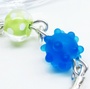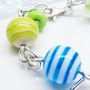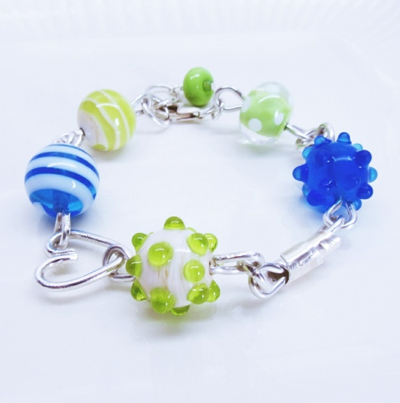 5 stk håndlagde (ikke av meg) lampworkperler i blå/turkis - limegrønt og hvitt er lenket sammen med egenproduserte ringer - et åpent hjerte og en link i sterling sølv. Perlenes størrelse er fra ca 12 - 15 mm.