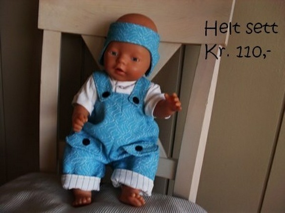Sett til Baby Born eller dukker som måler ca. 43 cmSelebukse/trøye og ørevarmereFave: Blå/turkis og hvitMønster av Anne Grethe Gaaserud