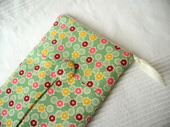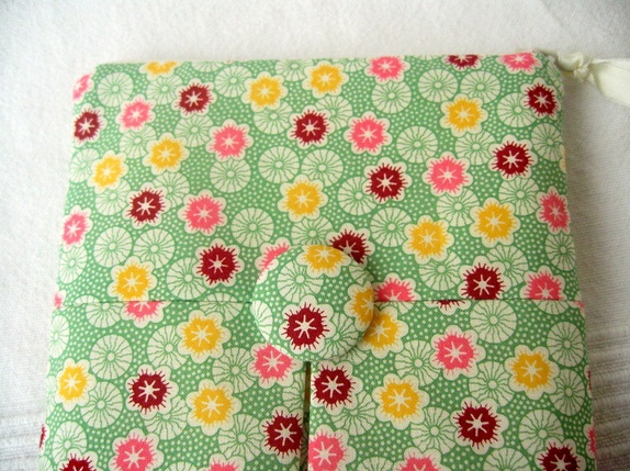 Stoffet minner om en sommerkjole fra 40-tallet, men er helt nytt. Lekker klar grønn bunn med blomster i rødt og gult.