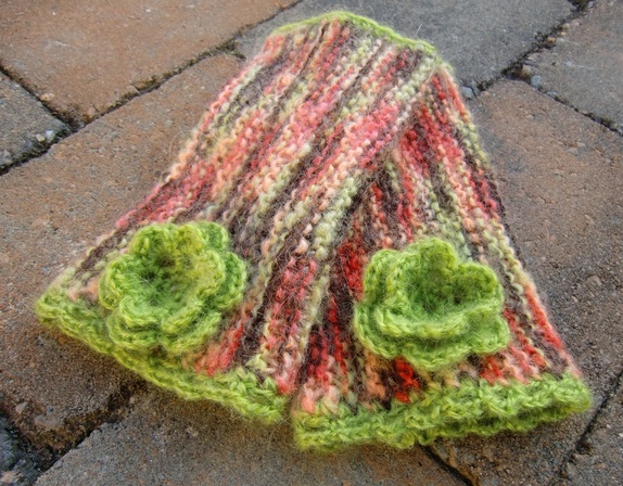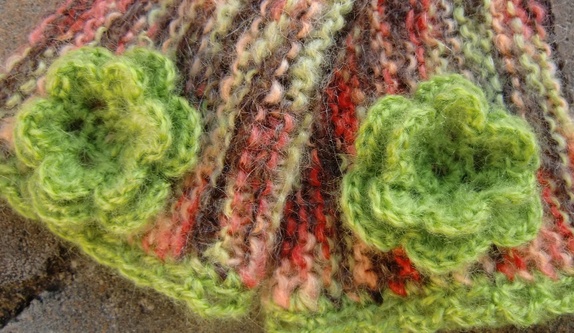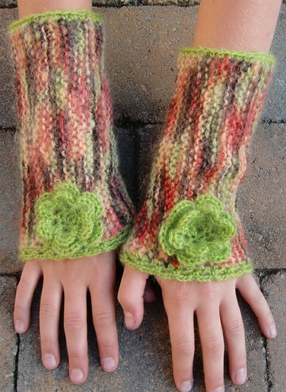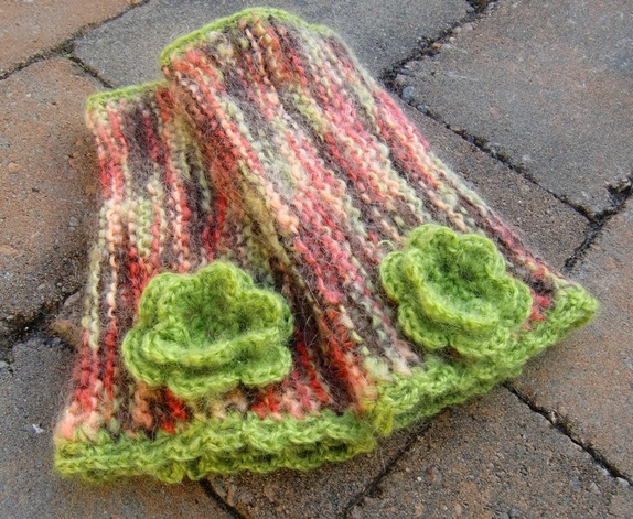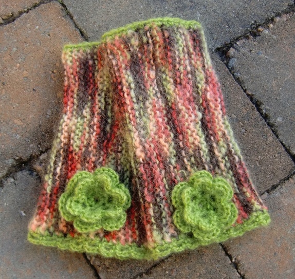 Gode og varme pulsvarmere i Mohair.Selve puslvarmerene er i flerfarget mohair, blomst og detaljer i en nydelig eplegrønn farge.