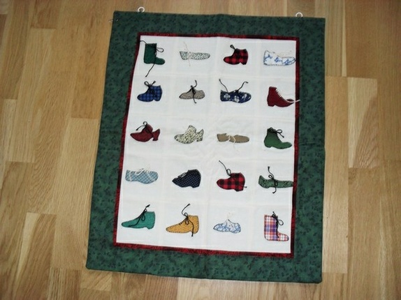 SkoteppeStørrelse: 46 x 56 cmFarver i hvitt, grønt og forskjellige farver på skoeneMønster i Familien 1997