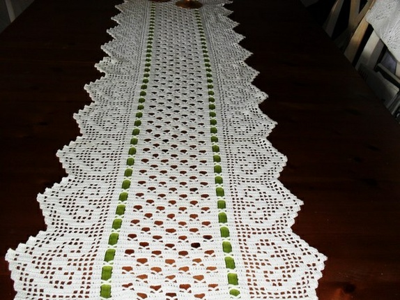 Lang duk med lysegrønt silkebånd (som kan skiftet ut etter ønske)Størrelse: 41 x 133 cmDuken er heklet i bommullsgarn