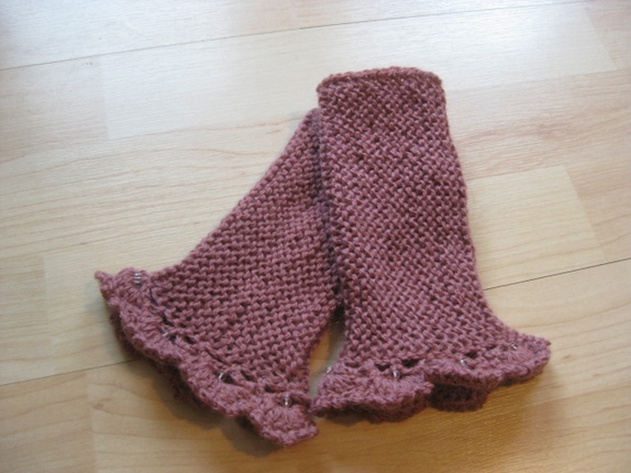 gammelrosa pulsvanter i dobbelt kamgarn,heklet blondekant med blanke perler.28cm lange