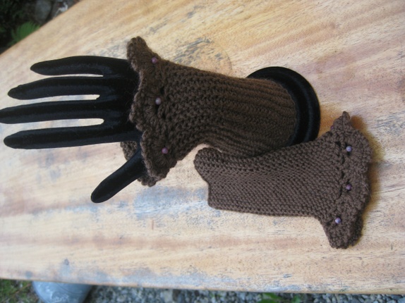 sjokoladebrune pulsvanter i babyull,heklet blondekant med perler.16 cm lange