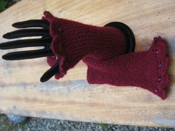 burgunderfarget pulsvanter i kamgarn, heklet blondekant med burgunderfargede perler27cm lange