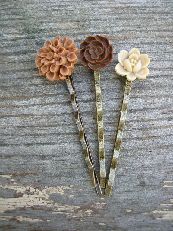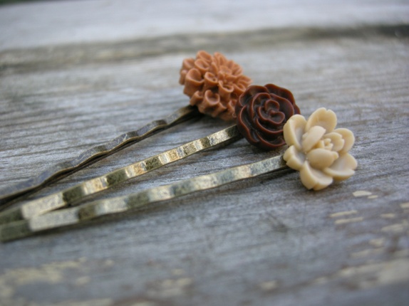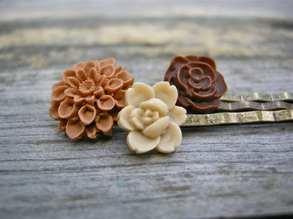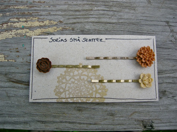3 nydelige hårspenner i beige toner og sjokolade brun.Hårnål i oksydert kobber med akrylblomster.Limet er profesjonelt smykke lim og etterpå lagt i herder. Hver spenne måler ca 5,5 cm.