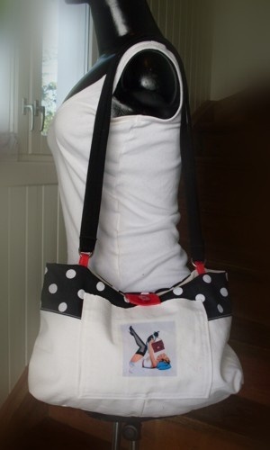 Skulderveske sydd av en gammel bomullsbukse og gargdinstoff. Vesken er fôret med offwhite bomullsstoff. Den har en lomme på innsiden og to pyntelommer på utsiden, den ene med strykemotiv. Knappelukking. Skulderremmene måler 82 cm