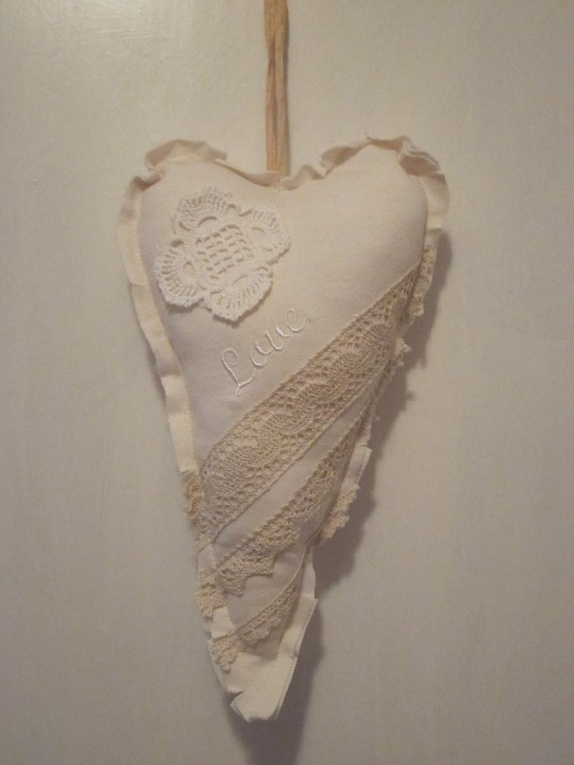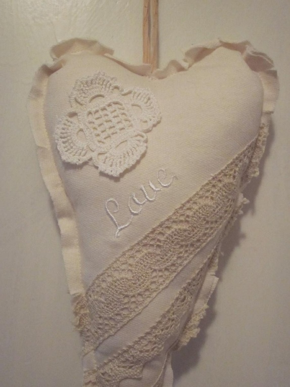 Vakkert hjerte pyntet med bånd og broderi.Sydd i jerseystoff.Hjertet måler 27 cm.