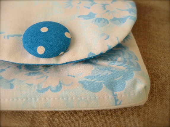 Liten pung laget i bomull, med fine detaljer.Foret med bomull - blå med hvite prikker.Lukkes med magnetlås.