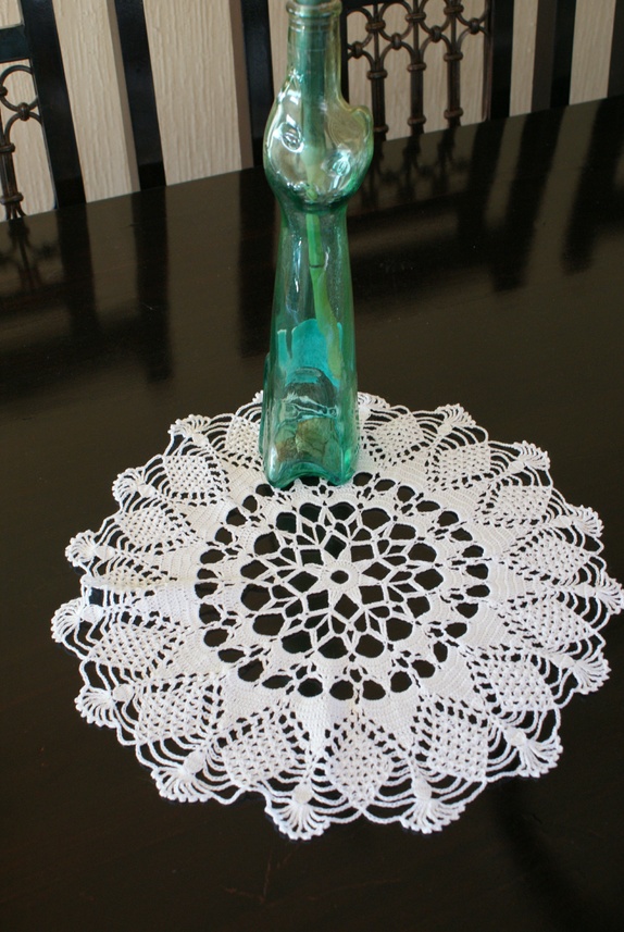 En hvit, heklet brikke, som ser bra ut på mørke bord! :)