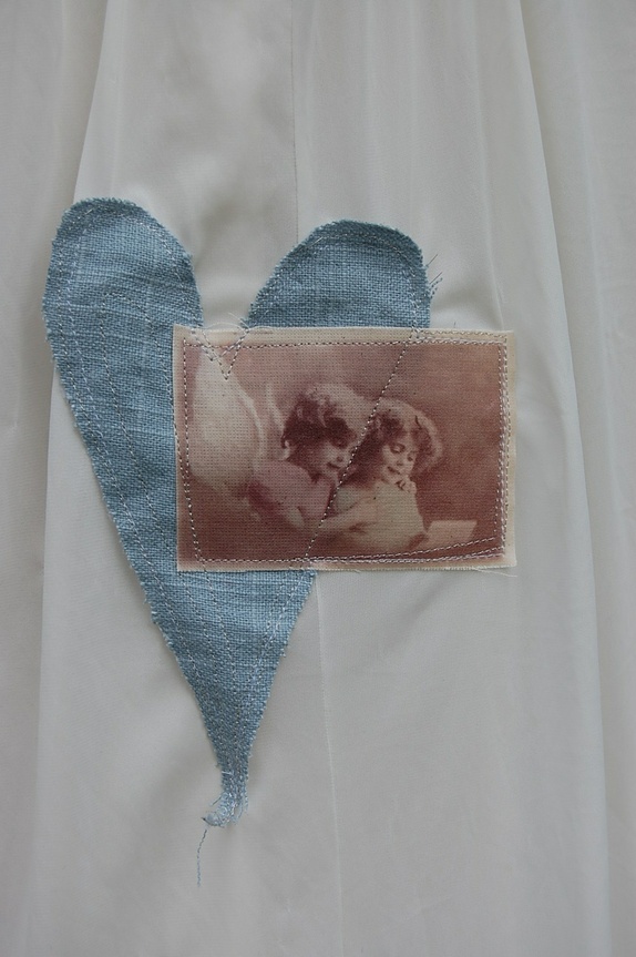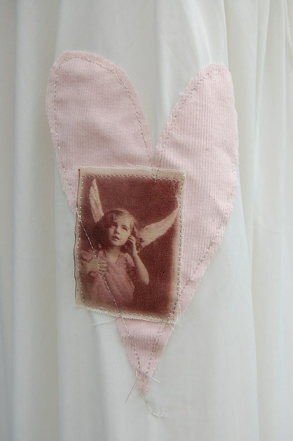 Det er påsydd tre hjerter med sølvtråd, to lyseblå lin hjerter, og et rosa babycord hjerte. Det er og dekorert med to nostalgiske englebiler. Hjertene frynser noe, og dette skaper en spennende kontrast til det myke og elegante.