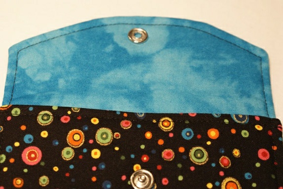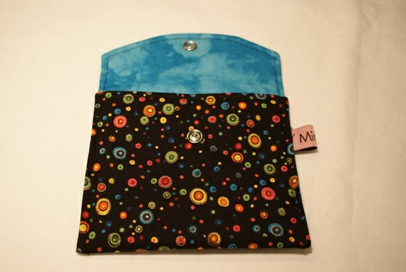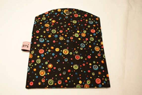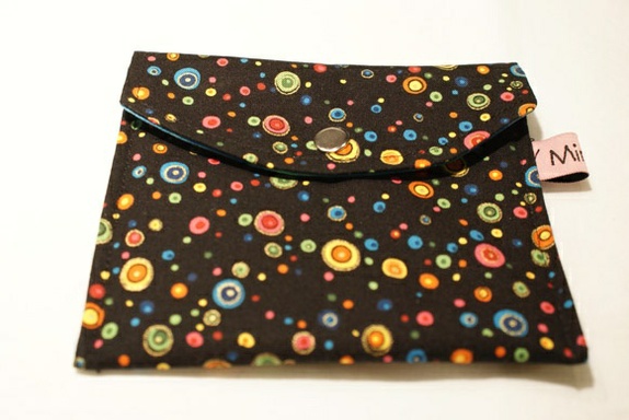 Hovedstoffet til etuiet/pungen er svart med sirkler i mange ulike spreke farger.