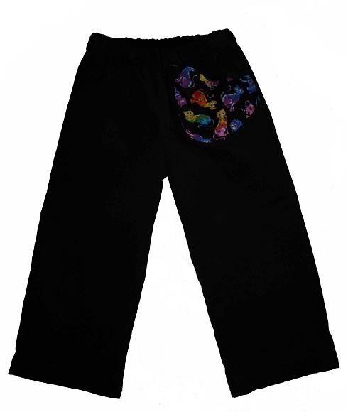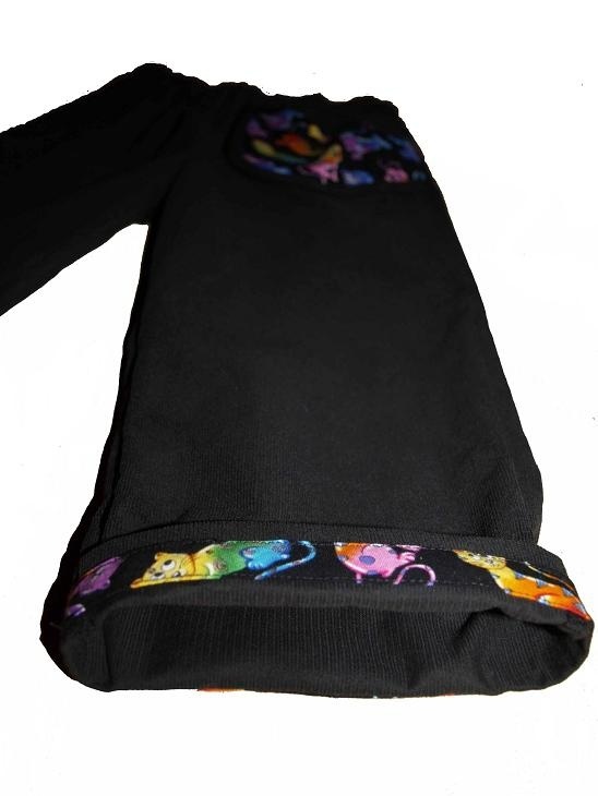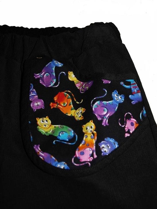 Bukse sydd av svart babycord og vevd bomull med kattemotiv. 100 % bomull.