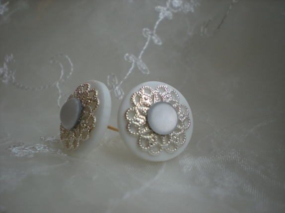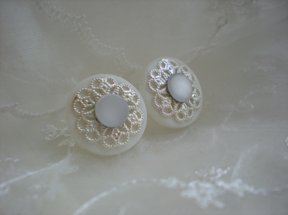 Hvite øredobber med sølvfarget pynt og hvite, matte swarovski-stener.