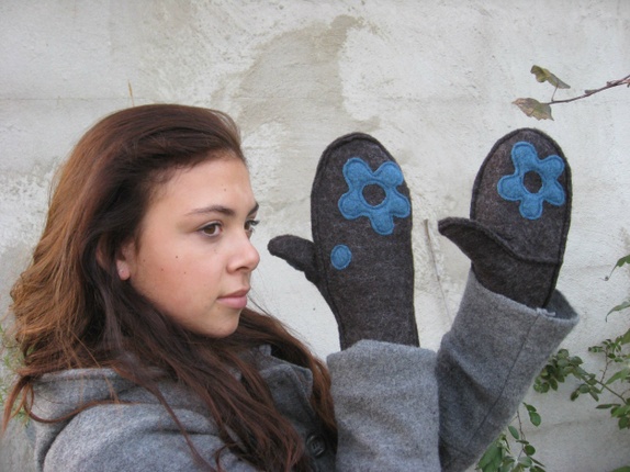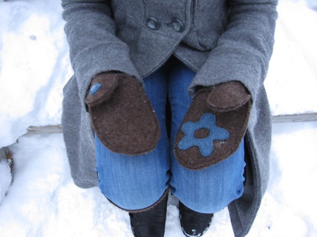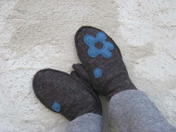 Brune ullvotter med blå blomster som varmer frosne fingre...