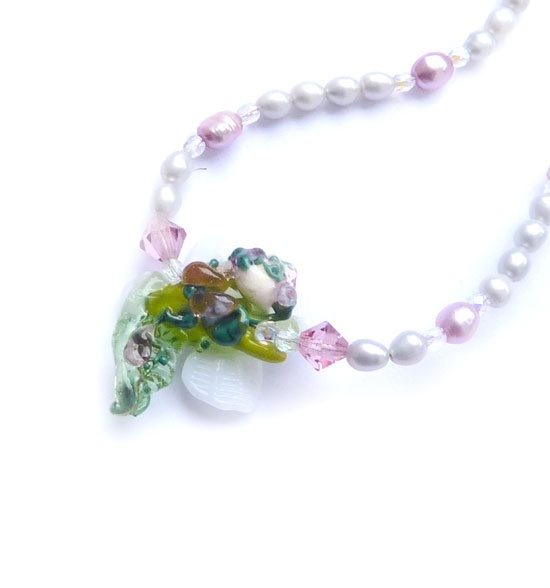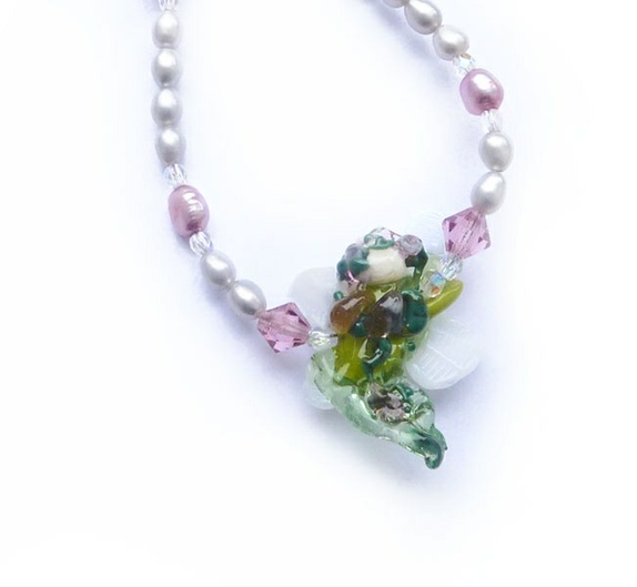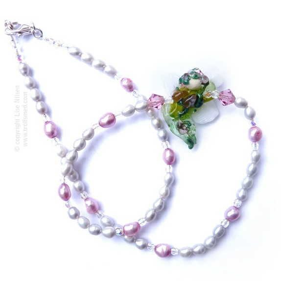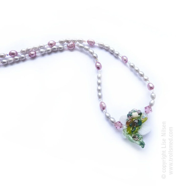 ...og så fikk den noen ferskvannsperler og andre glassperler.... Og sølv lås... - jeg har nemlig lært at man skal ikke tulle med småfolket!