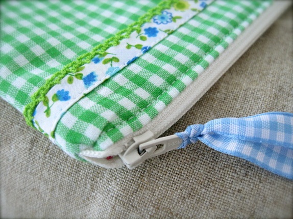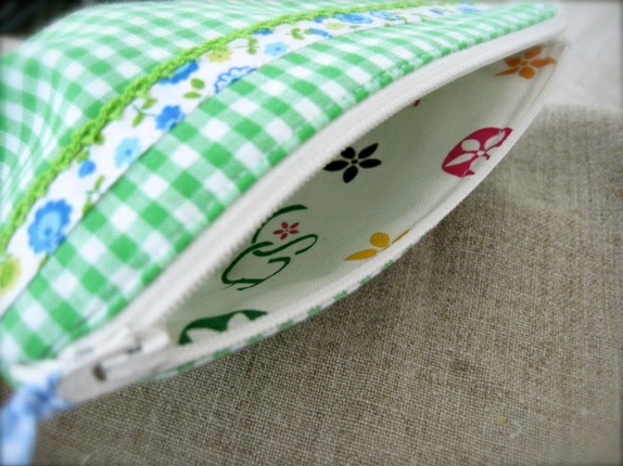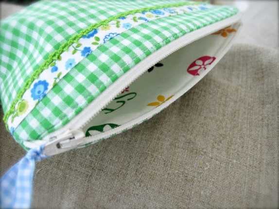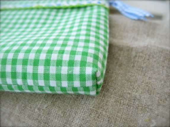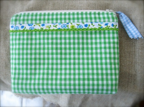 - En middels stor pung laget i et trivelig bomullstoff smårutet grønn og hvit.