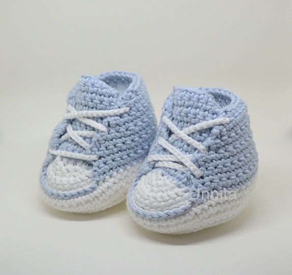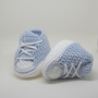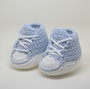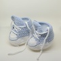 Lysblå og hvite babysko (converser) heklet i Pt petunia (100% pima bomull). De er myke, gode og varme og sitter godt på foten.