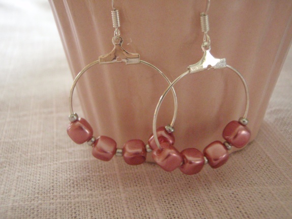 Kjempesøte kreolringer med gammelrosa firkantede perler og små, sølvfargete småperler.