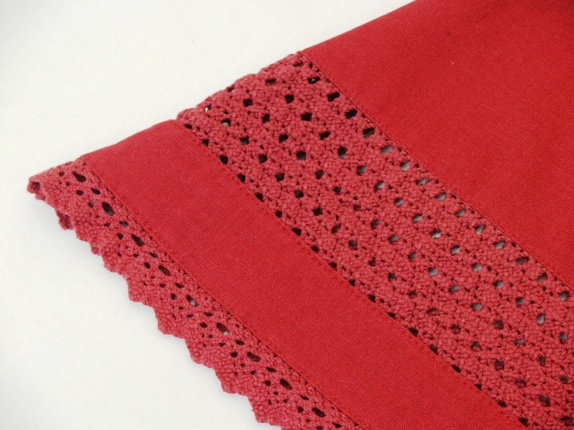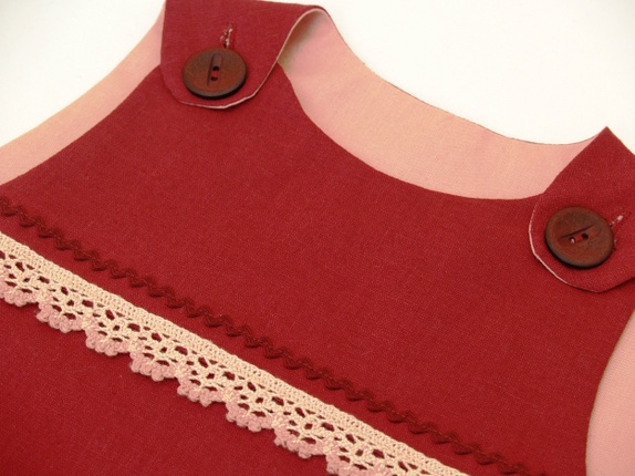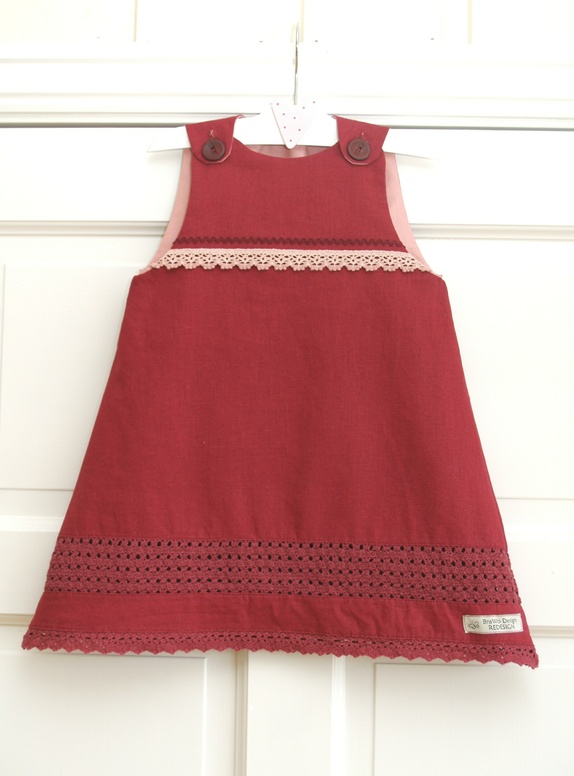Nydelig, lett hengslekjole, sydd av en burgunder damekjole i 55% lin og 45 % bomull. Pyntet med burgunder vevd blonde og mellomverk nederst på kjolekanten, og en gammelrosa vevd blonde og en burgunder kroklisse over brystet. Samme pynt foran og bak på kjolen. Mørk burgunder knapper preget med snirkelmønster. Overdelen er foret med et gammelrosa bomullsstoff