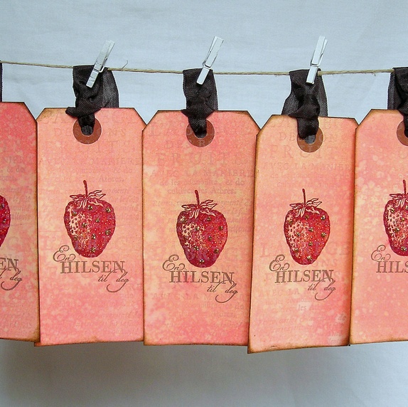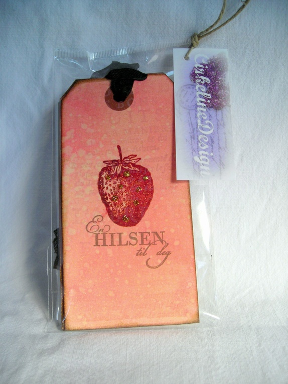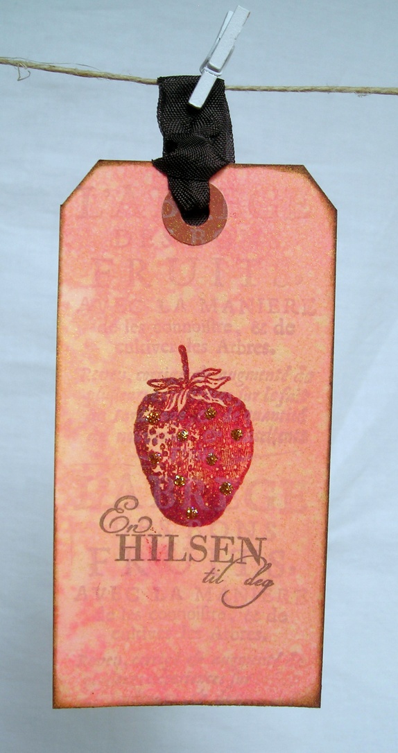 Jeg har farget bakgrunnen med "distress ink" i rosatoner, stemplet jordbæret i rødt og påført gullglitter som skal forestille groene på bæret. Svertede kanter bidrar til å gi kortene en "vintage look". "En hilsen til deg" er stemplet i sjokoladebrunt.