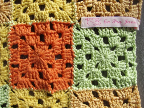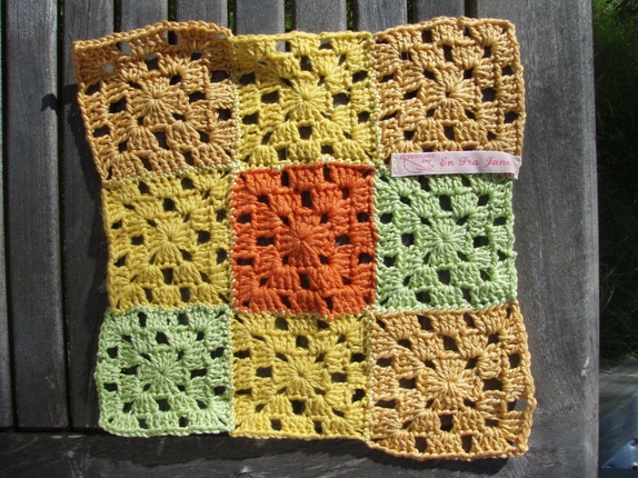 God kjøkkenklut heklet i bomull.Kluten består av 9 bestemorruter som er sydd sammen.