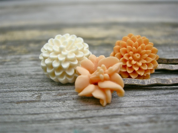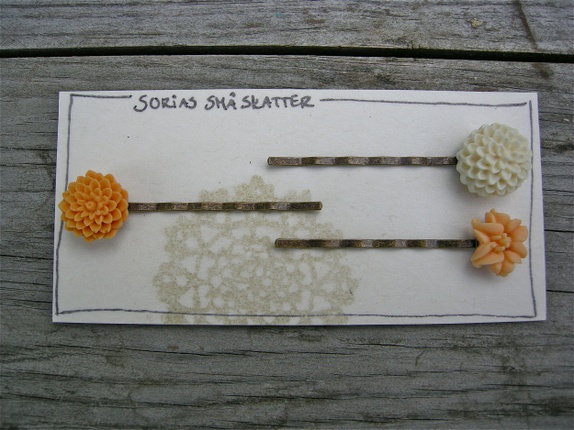 3 nydelige hårspenner i fersken og krem.Hårnål i oksydert kobber med akrylblomster.Limet er profesjonelt smykke lim og etterpå lagt i herder. Hver spenne måler ca 5,5 cm.
