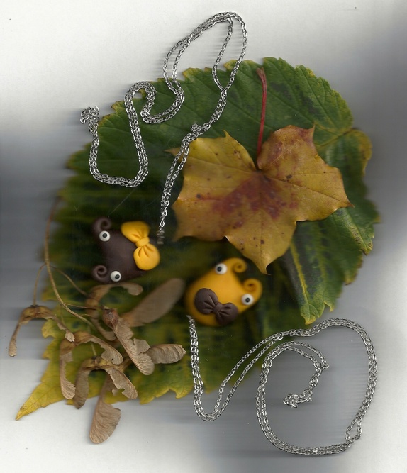 Et brunt monster med gul sløyfe på. Beina i krøll og selvlysende øyne.