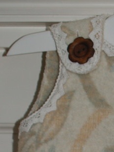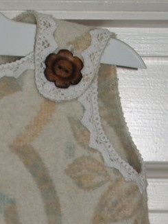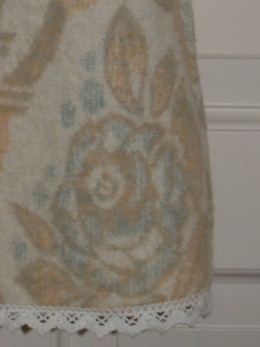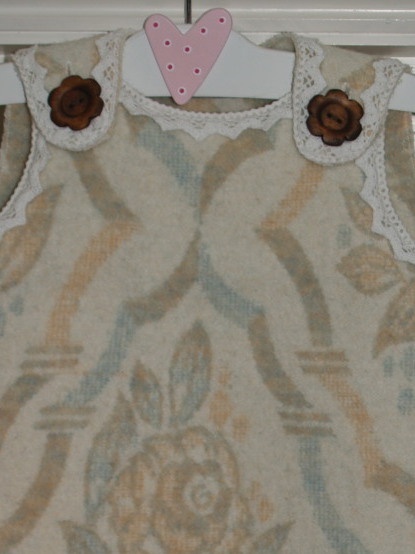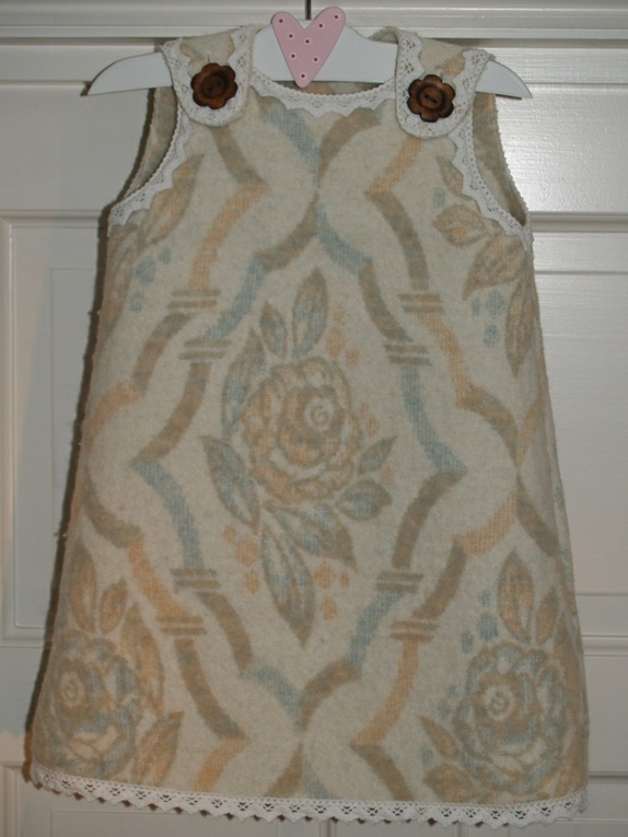 Tykk ullkjole, god og varm. Sydd av et vakkert, nostalgisk ullteppe, pyntet med blondekant i bomull og flotte treknapper. Super til en liten frøken som vil være fin på kalde vinterdager.