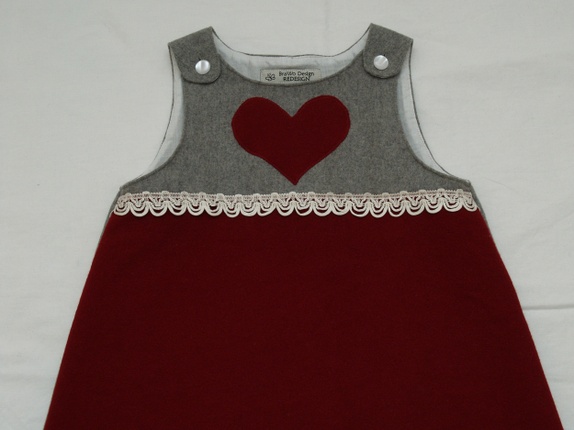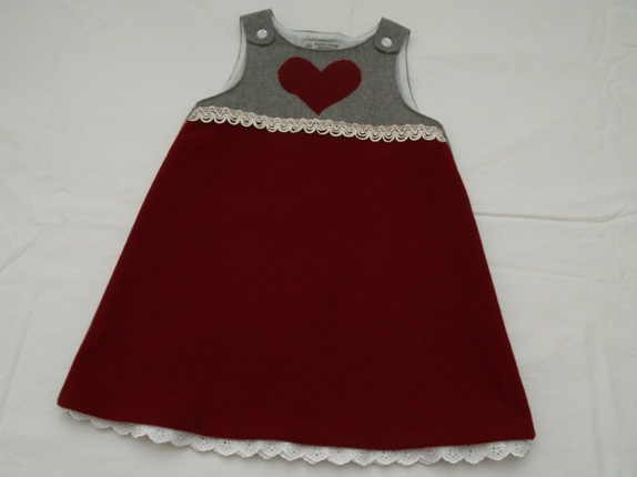 Penkjole i ren ull, sydd av ytterstoffet fra to dressjakker i ull. Helforet med tynt, nytt bomullsstoff som er kantet med en blonde som titter frem nederst under kjolekanten. Kjolen er pyntet med applikert hjerte, en nostalgisk blonde og perlemorsknapper.