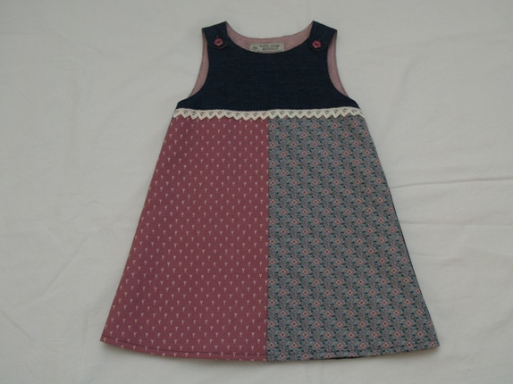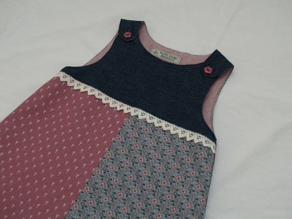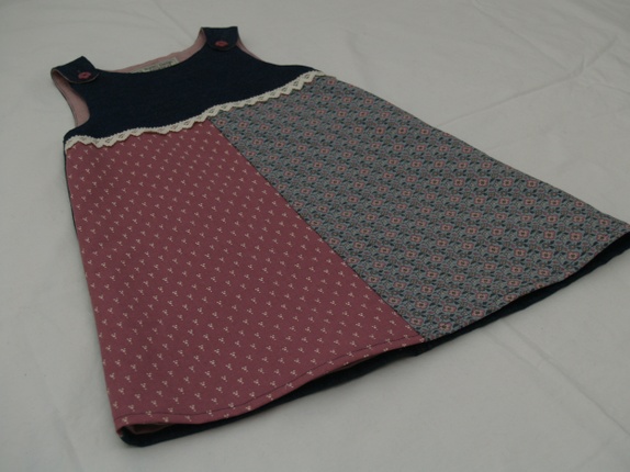 Helforet hengslekjole med god passform som barnet kan vokse i. Sydd av dongeribukser og bomullsgardiner. Foret med rosa duk i bomull. Pyntet med hvit bomullsblonde og søte, gammelrosa blomsterknapper. Baksiden av kjolen er i ensfarget, blått dongeribuksestoff.