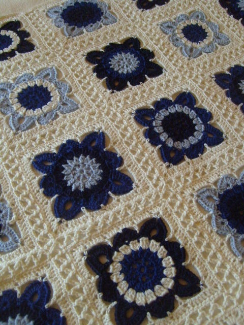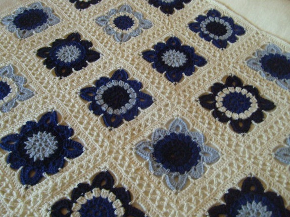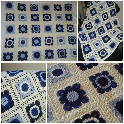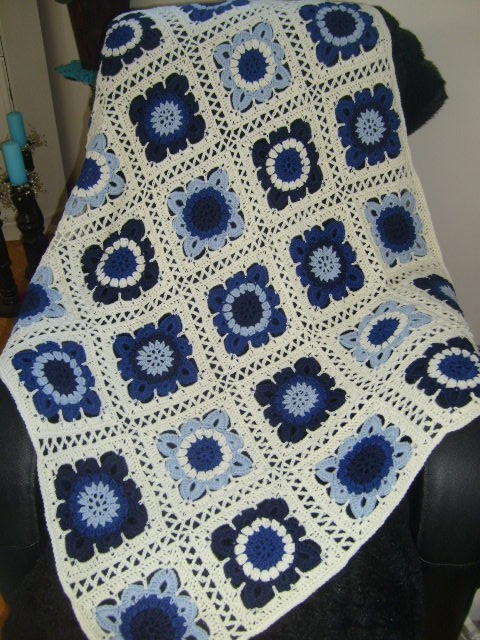 Pleddet er heklet i et nydelig mønster med 3 forskjellinge blånyanser og bunnfarge i natur.