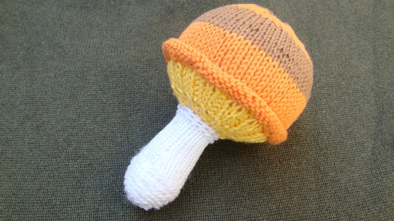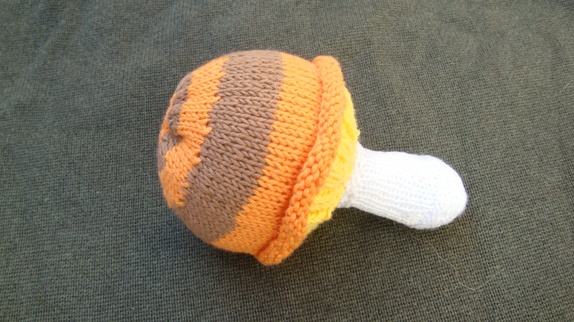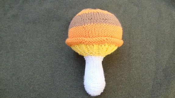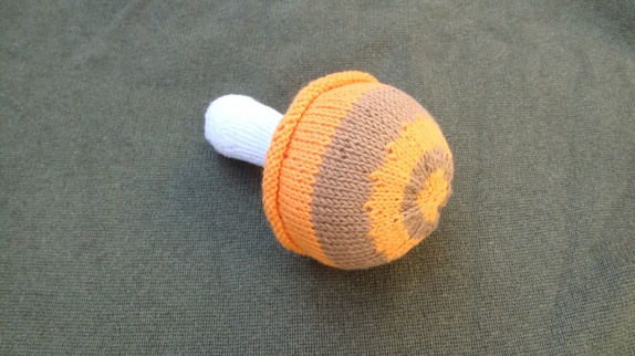 Babyranglen er strikket i 100% bomull.Og kan vaskes i maskin.Den er fylt med fyllvatt og en liten ball med bjelle i.Høyden på ranglen er ca 14 cm.