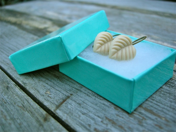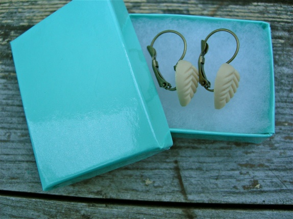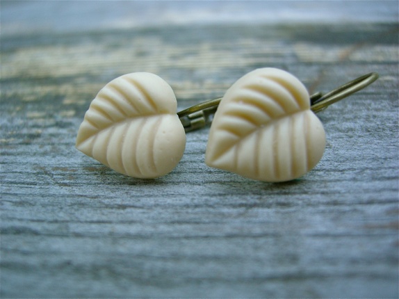 Vakre øredobber med cremefarget blad .ørekrok i oksydert kobber med sikkerhetslås bak.Limet er profesjonelt smykke lim og etterpå lagt i herder.