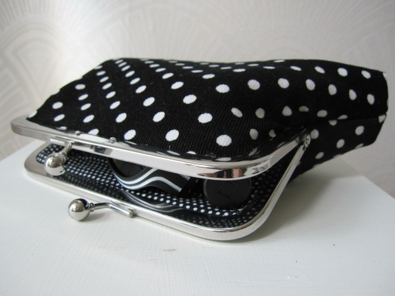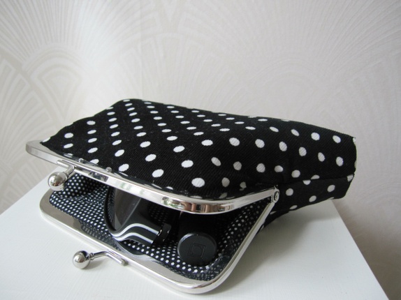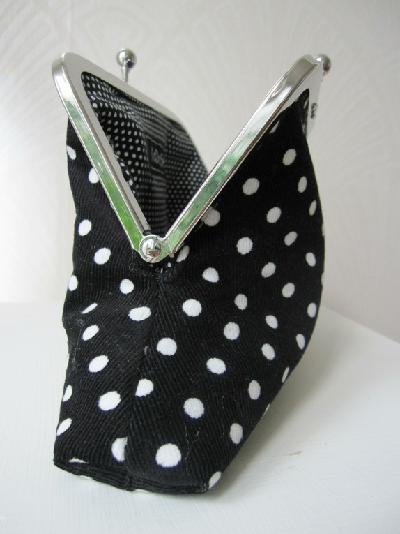 Utsiden er sydd av babyfløyel. En kortlomme på innsiden.Veskevatt og vliselin som mellomlegg. 3 små Svarkowzykrystaller på hver side av rammen.ramme 15cm bred og 6,5 cm høy.Total høyde på pungen 13 cmBredde nederst 21 cm, bunn ca 4 cm