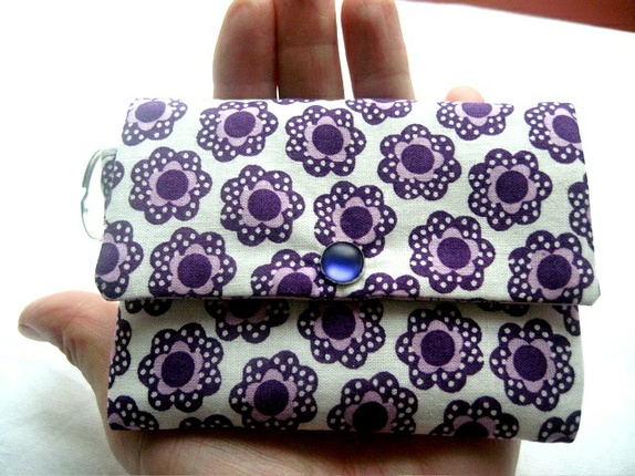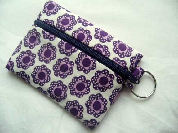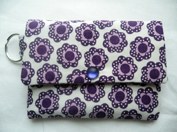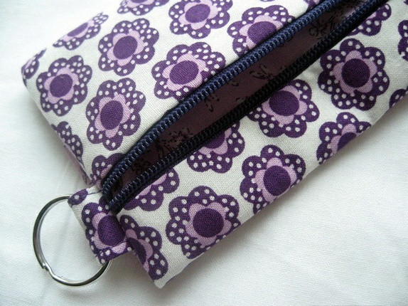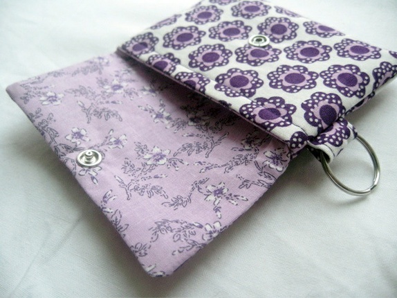 Sydd av bomull med lilla blomster. Foret med lavendelfarget bomull. Det er strykeinnlegg på alle stofflagene. Forterket søm ved feste til nøkkelring.