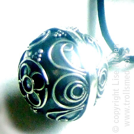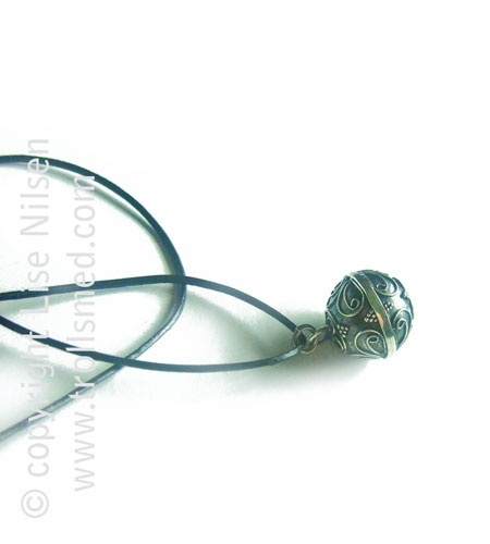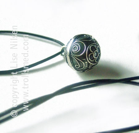 En nydelig sølvkule i 925 sølv med filigranarbeid utenpå. Henger i lang lang sort tynn lærsnor.