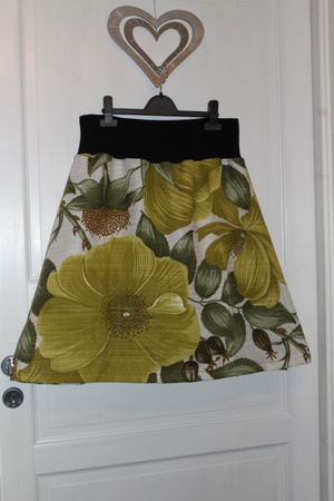 Skjørtet er sydd av ei gardinlengde frå 70-talet. Det er fòra, og har svart ribb i livet.