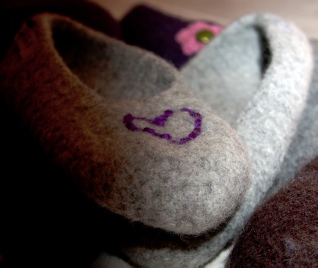 Grå tøfler med brodert hjerte i lilla farge. Tøflene er i 100% ull og kan vaskes på vanlig ullprogram.
