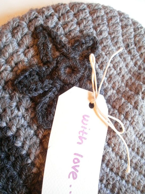 Heklet i lysegrått topp t tå garn, med mørkegrå kant og blomst.Denne lua passer til voksne :)