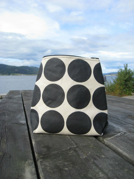 Mellomstor pung med 15 cm glidelåsåpning. Pungen er sydd i et beige akrylbelagt bomullsmateriale med store sorte prikker og har en sort glidelås.