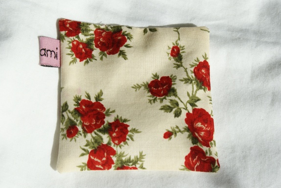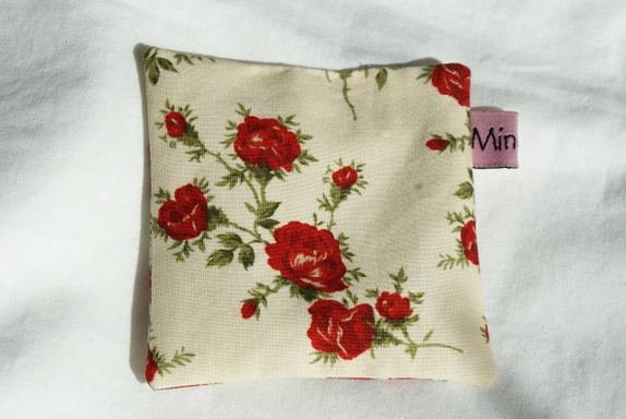 Lavendelposen har bunnfarge i offwhite med røde nydelige roser. Posen har samme type stoff på begge sider.