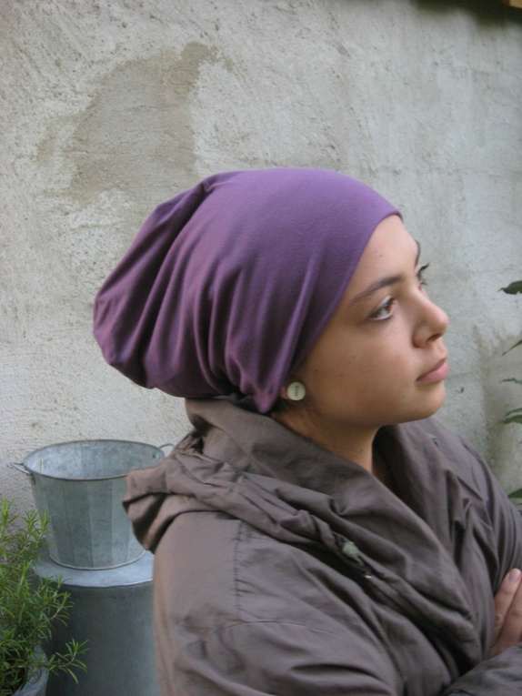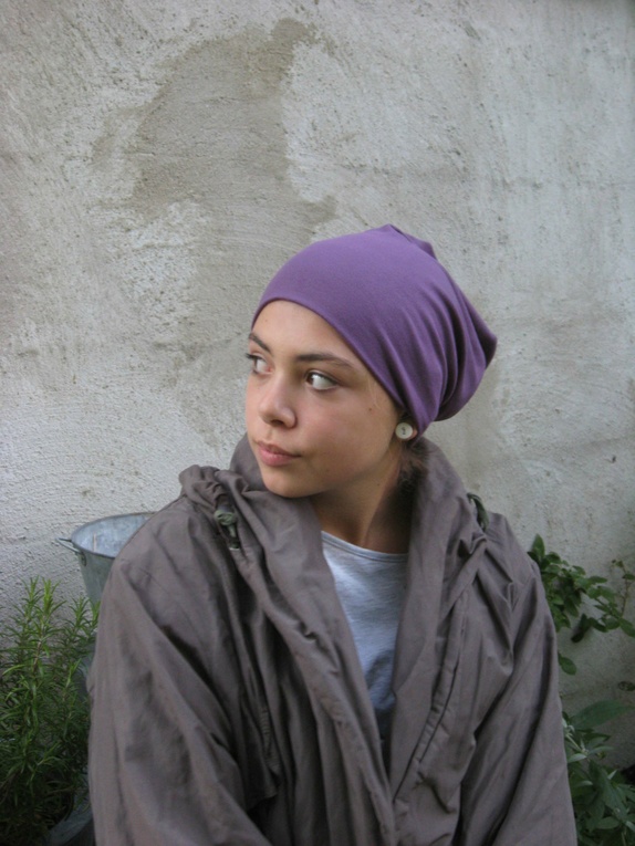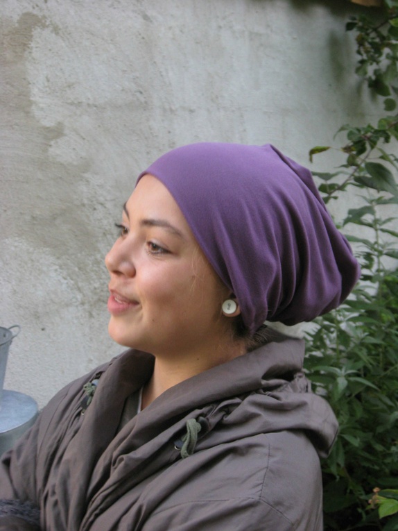 Luen er sydd i en lilla viscosejersey og har en "baggy" fasong.