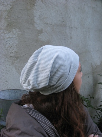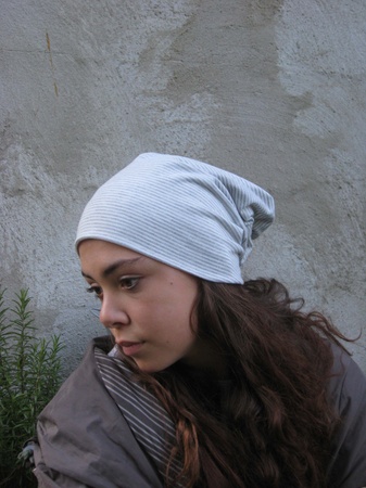 Smalstripete lysgrå og hvit lue i bomullsjersey