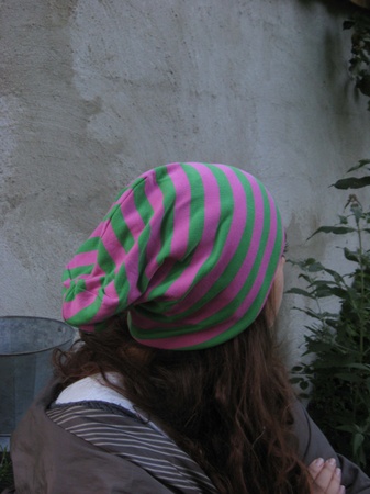 Luen er sydd i en stripete bomullsjersey i grønt og rosa. Den har en "baggy" fasong.