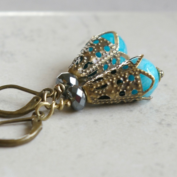 Håndlaget ørepynt med vakre, blå-turkise perler av jade med filigran perlehetter. Oppå disse er det små, fasetterte perler av hematitt. Metallet er antikk messing og messingfinish.