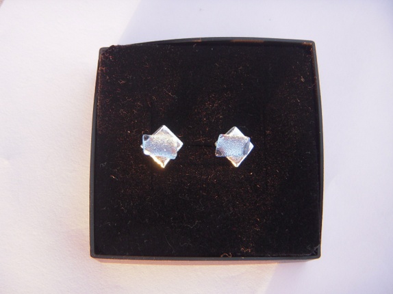 Ørepynt med sølv- og isblåfarvet glass. Håndlaget og unikt. Kirurgisk stål bak.